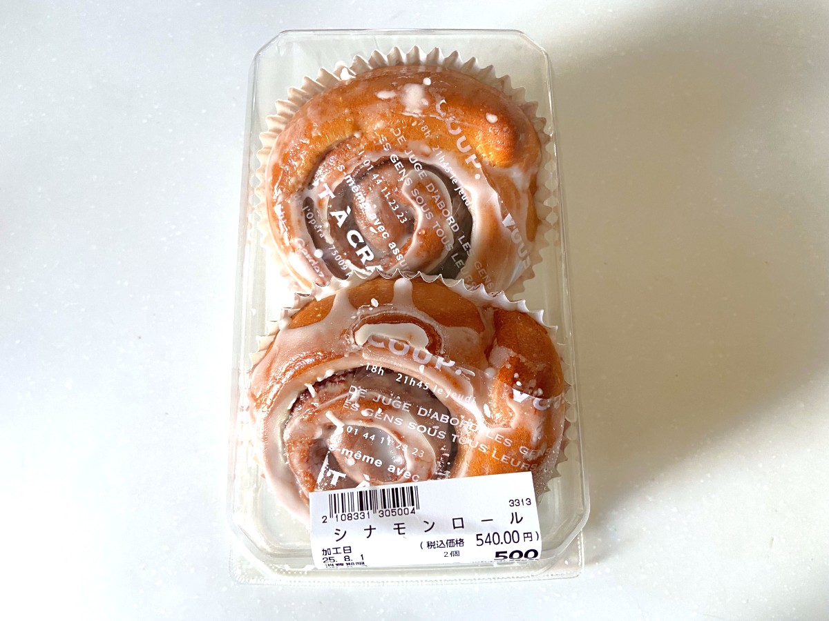 ベーカリーコーナーに新登場のシナモンロールはパックに2個入り!