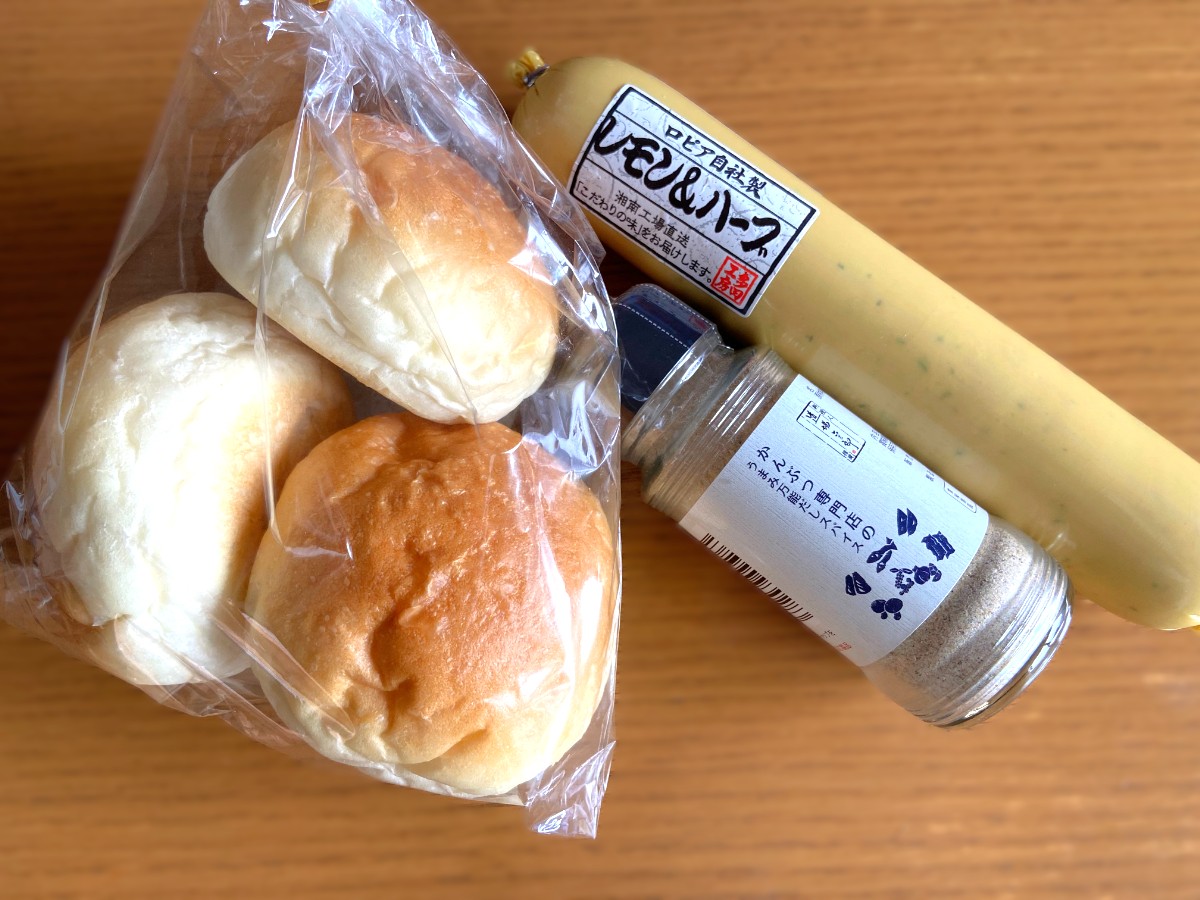 お店で焼いている天然酵母のパンと、新商品のソーセージ、売り切り価格になっていた調味料を買いました。