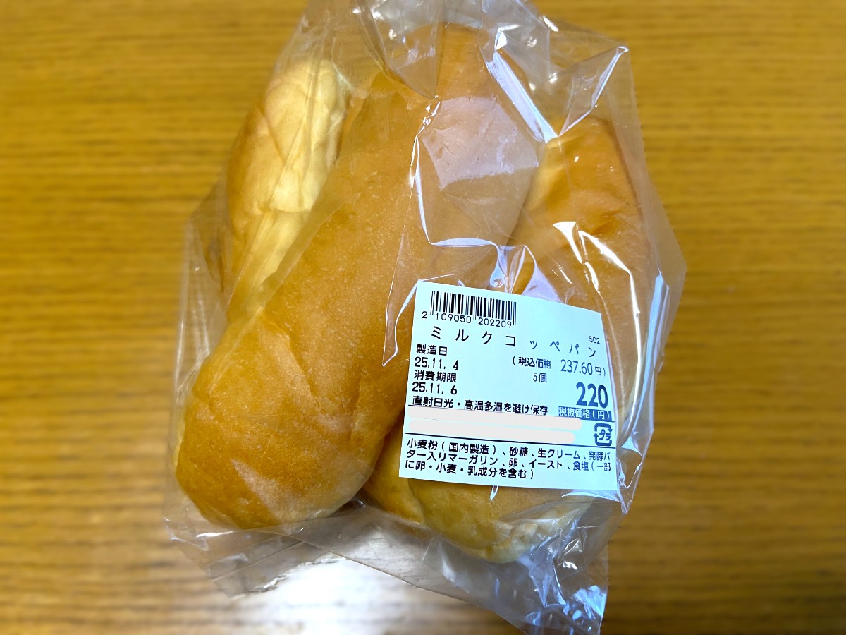 ベーカリーコーナーの品揃えが充実している店舗に通っているので、いつもベーグルやクロワッサンなどいろいろ買うのですが、今回はシンプルにコッペパンを。