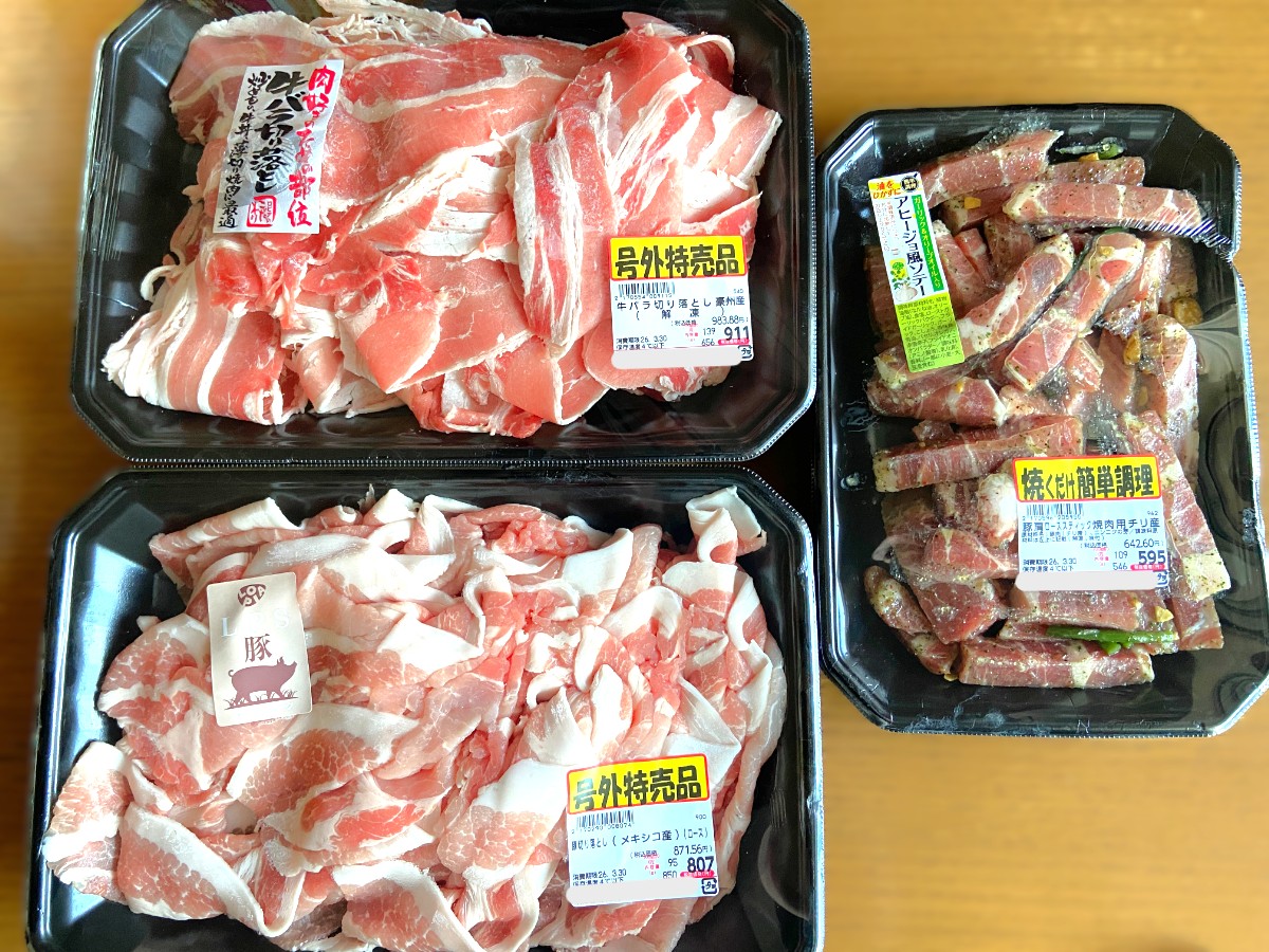 号外特売品の牛肉と豚肉を購入。