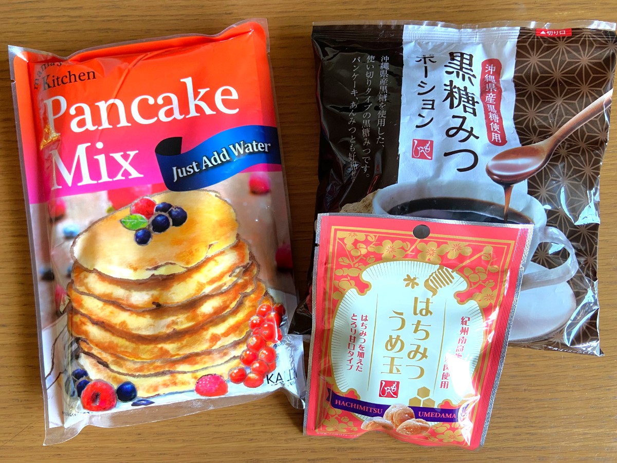 パンケーキが大好きな娘たち用にパンケーキミックスと、この日の目的の黒糖みつはボトルではなく使い勝手の良いポーションで。