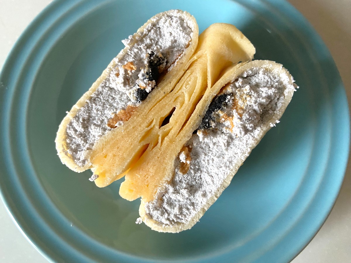 本当は黒ごまの餡がもっともっとたっぷり入っています。ホイップも黒ごまでねっとり濃厚な黒ごま餡にもっちりクレープの相性もばっちり。